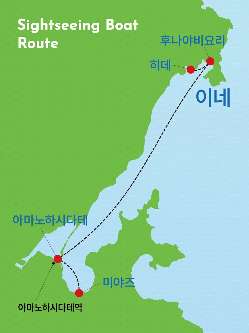 이네만 연안에 늘어선 독특한 후나야(수상 가옥) 건축군은 마치 해수면 위에 떠 있는 듯한 환상적인 풍경을 만들어냅니다. 이러한 특별한 경관은 선상에서만 감상하실 수 있습니다. 일상의 번잡함에서 벗어나 이네의 고요함과 매력을 온전히 느끼며 편안한 시간을 보내시기 바랍니다.