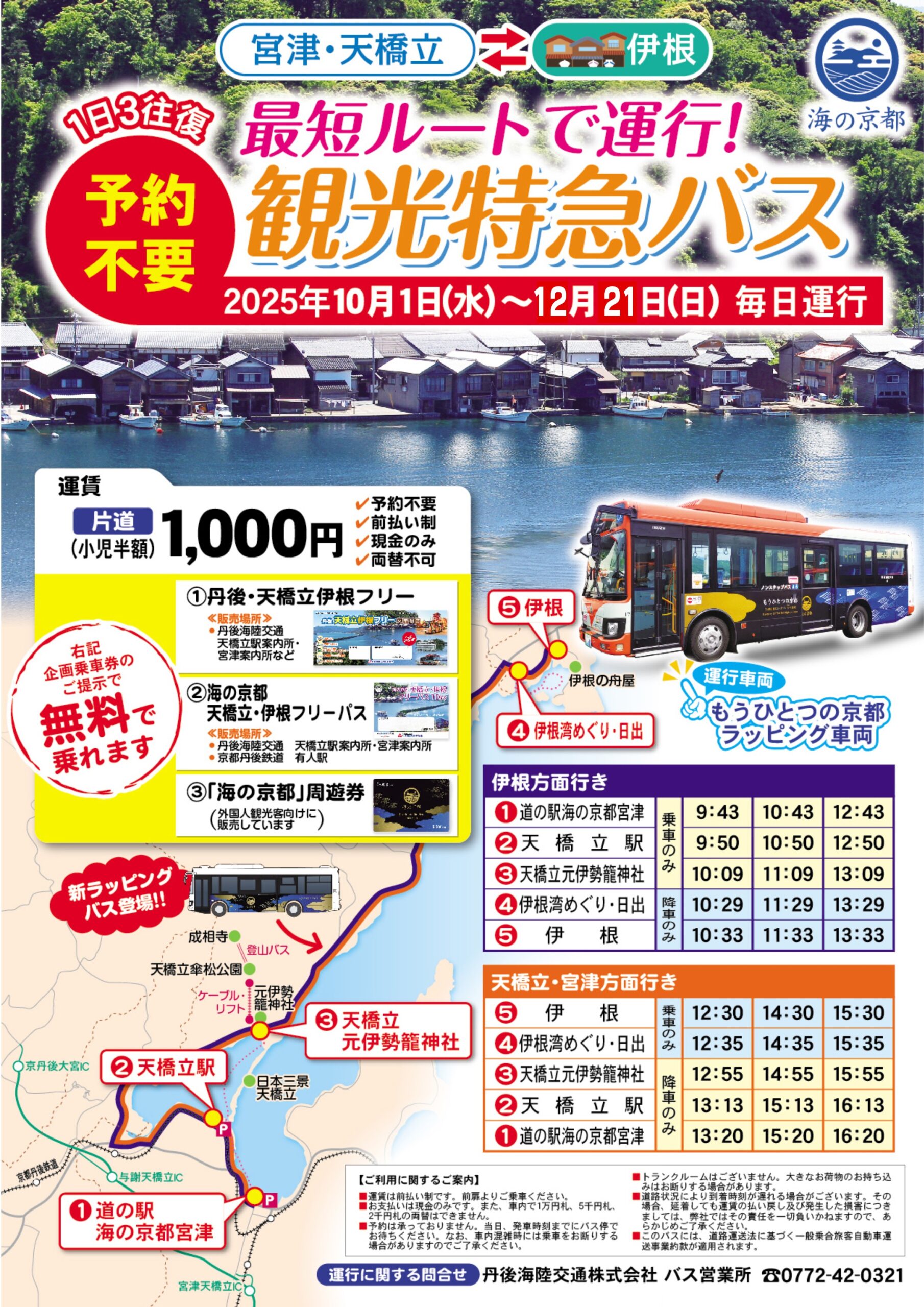 宮津・天橋立~伊根間を直行で運行する「観光特急バス」を次のとおり運行中です。