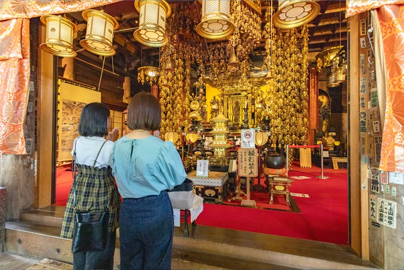 本堂の軒下を見上げると、江戸時代の伝説的な彫刻職人・左甚五郎の作と伝わる、見事な龍の彫り物に出会えます。通常、龍の彫刻は横を向いていることが多いのですが、この龍は珍しく正面を向いて彫られていることから「真向の龍」と呼ばれています。驚くべきはその眼の配置の巧妙さで、右から見ても左から見ても、あるいは下から見上げても、龍の鋭い視線が常に自分を真っ向から見据えているように感じられます。